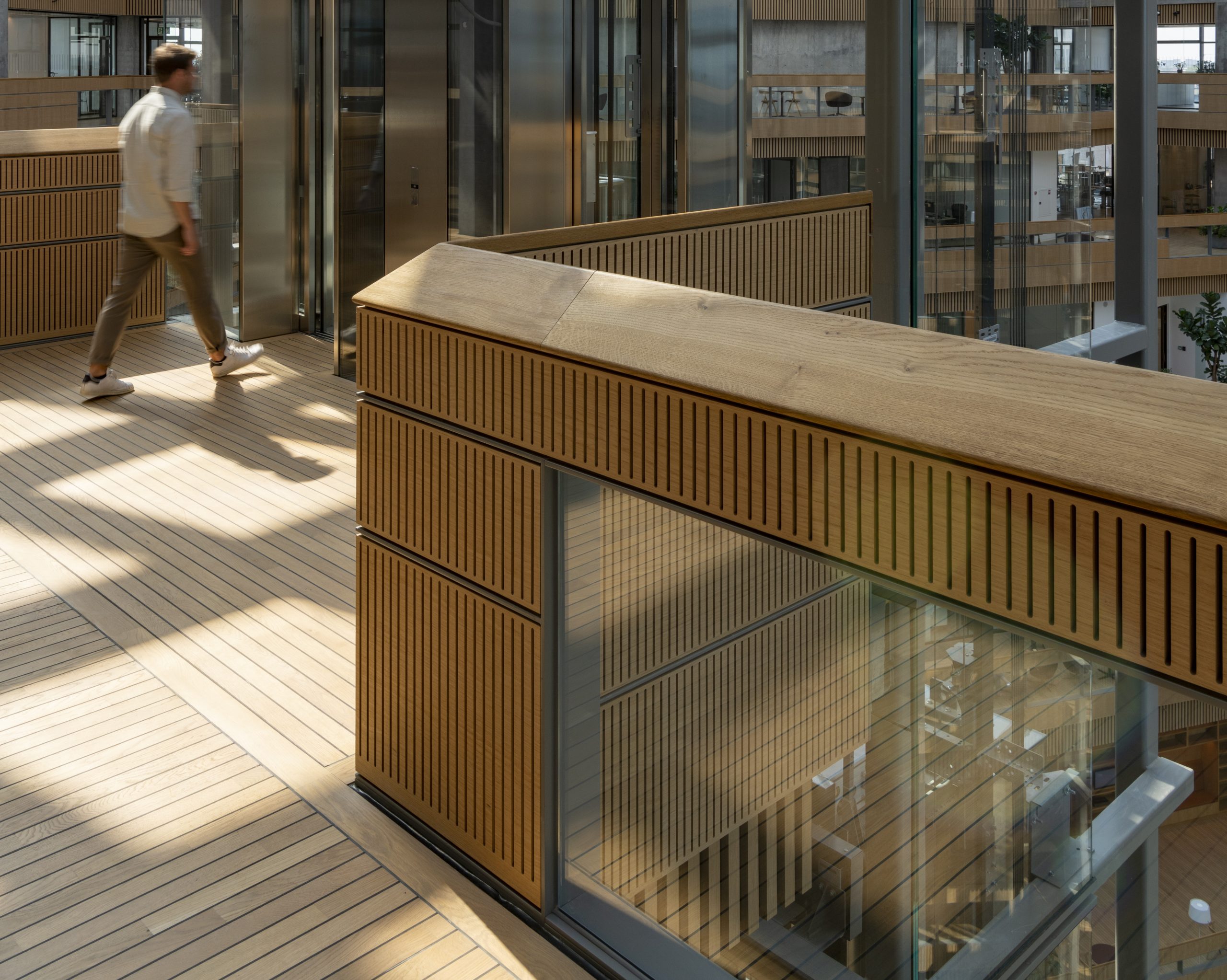 The choice became a contemporary interpretation of a traditional ship’s deck. Hørning supplied oak long-strip parquet with inlaid black rubber joints, a detail that references the historic “flådeegetræer,” the fleet oaks chosen for Danish naval ships in the early 1800s. The result is a floor rooted in craftsmanship and symbolism, elegantly bridging corporate modernity with seafaring tradition.