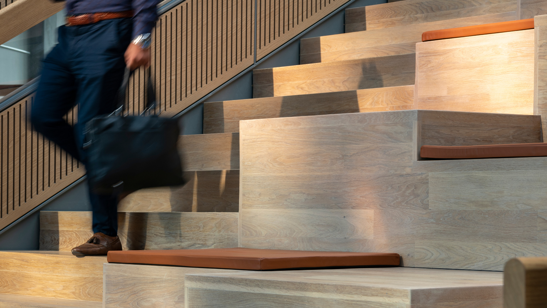 The long-strip oak parquet, precisely detailed with rubber inlays, gives the interior a calm, linear rhythm that complements the building’s sculptural geometry. It provides both warmth and robustness, essential in a high-traffic environment designed for hundreds of daily users. The material expression echoes the building’s architectural concept: strong, confident and distinctly connected to place.