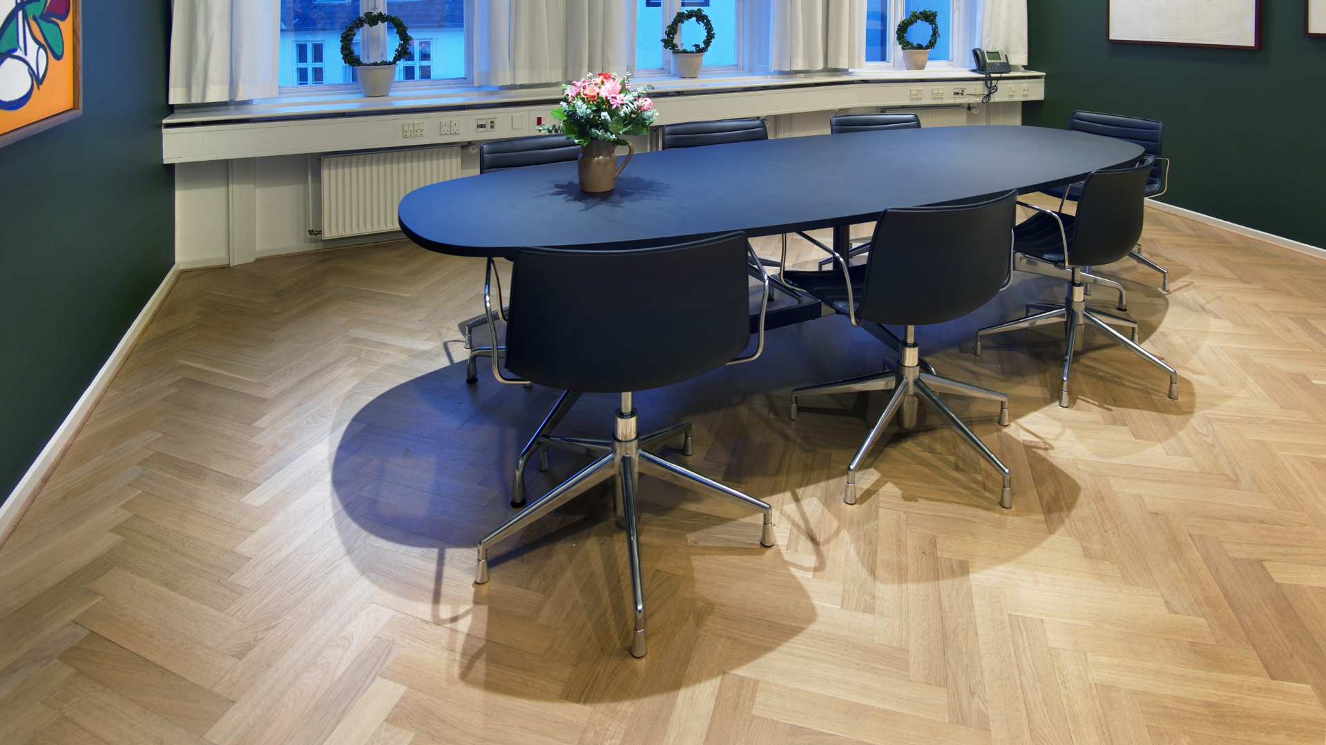 For the flooring at Højbro Plads 4, Hørning supplied a certified oak herringbone floor, sourced from responsibly managed forests. This choice reflects a natural continuation of Danish design traditions while paying subtle homage to the building’s original character. The classic herringbone pattern adds structure and rhythm to the rooms, echoing the geometric precision of the building’s neoclassical origins.